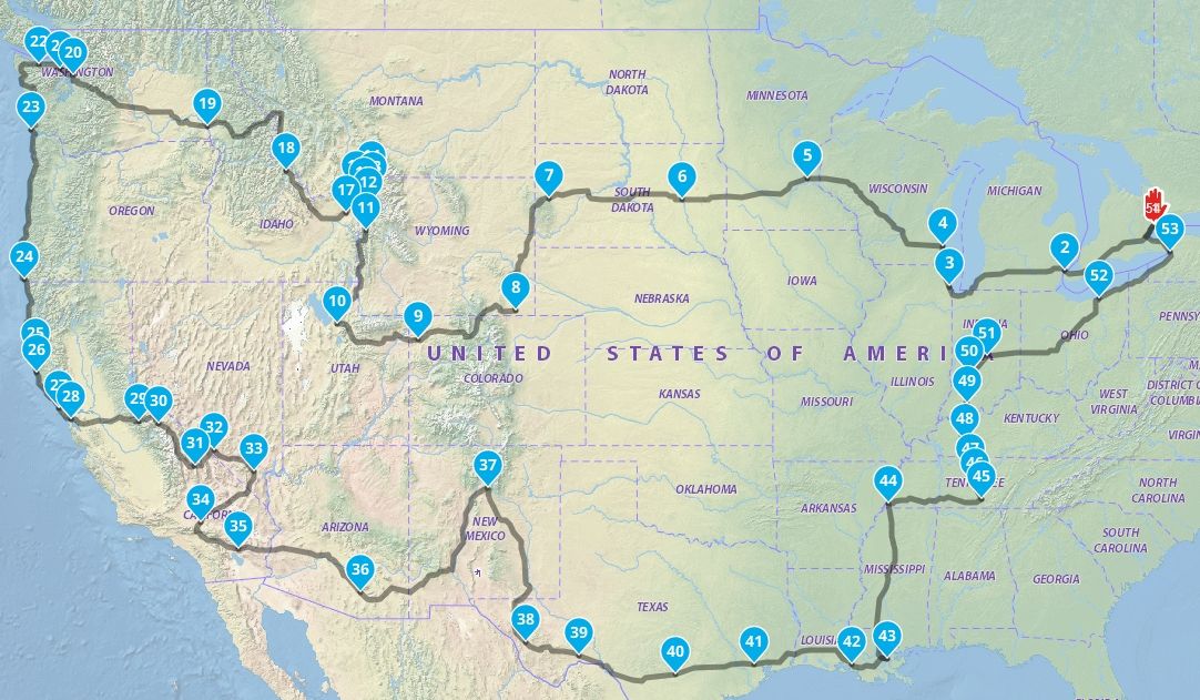 Pendant 90 jours et plus de 20 000 kilomètres, je pars à la découverte des paysages mythiques et des routes légendaires des États-Unis. De la côte Est à la côte Ouest, des plaines infinies du Midwest aux déserts flamboyants de l’Arizona, en passant par les Rocheuses, les parcs nationaux et les mégapoles emblématiques, ce voyage est une véritable traversée de l’âme américaine.